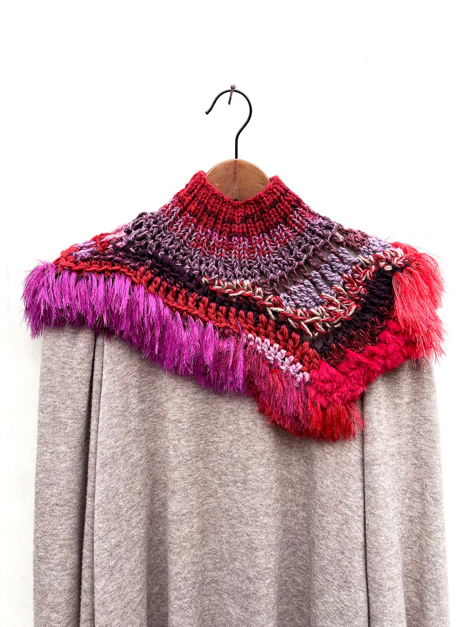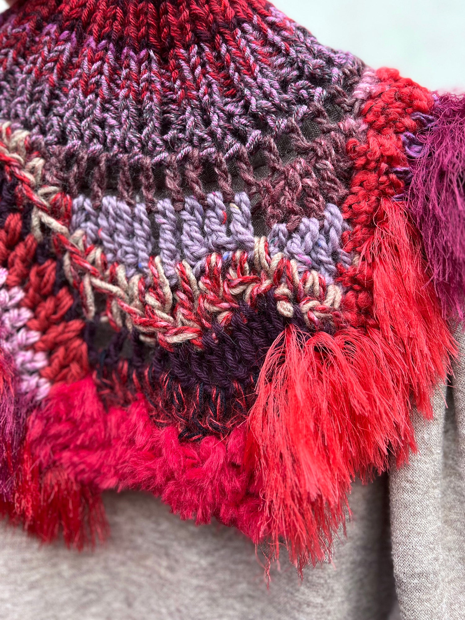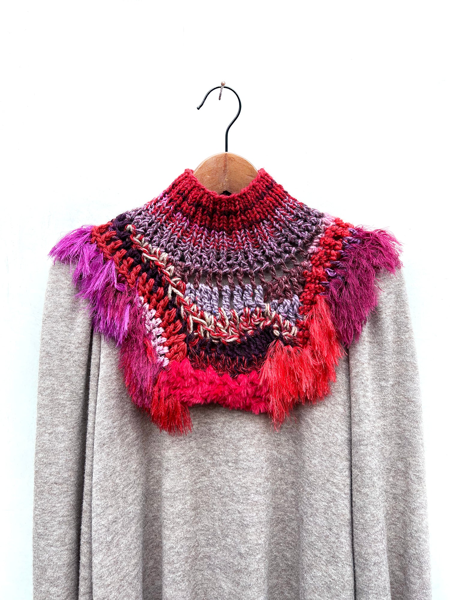 Wrap yourself in this one-of-a-kind neckpiece and feel the warmth of something special. Handmade with a mix of soft textured yarns, a touch of faux fur and wispy fringe.?