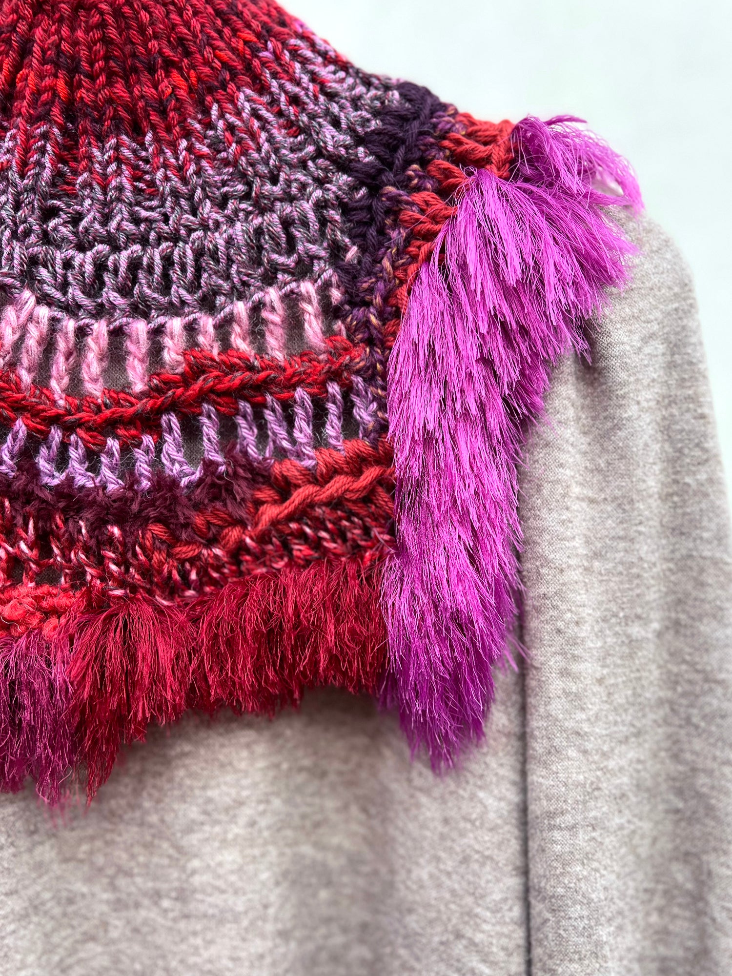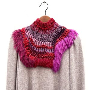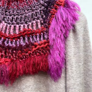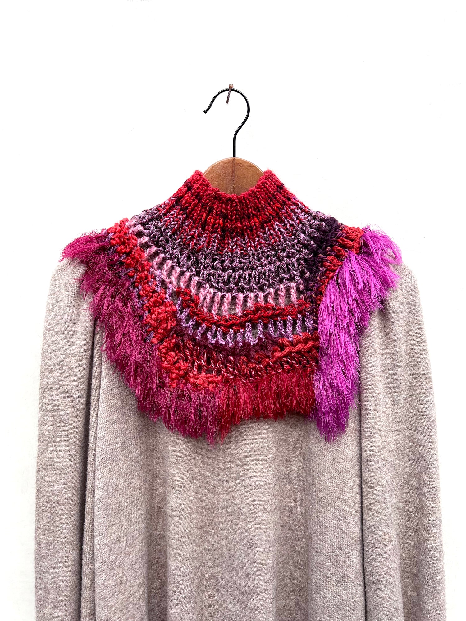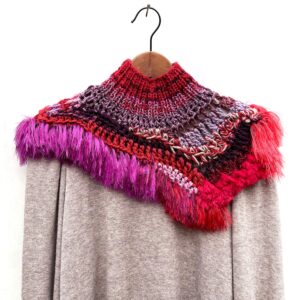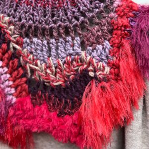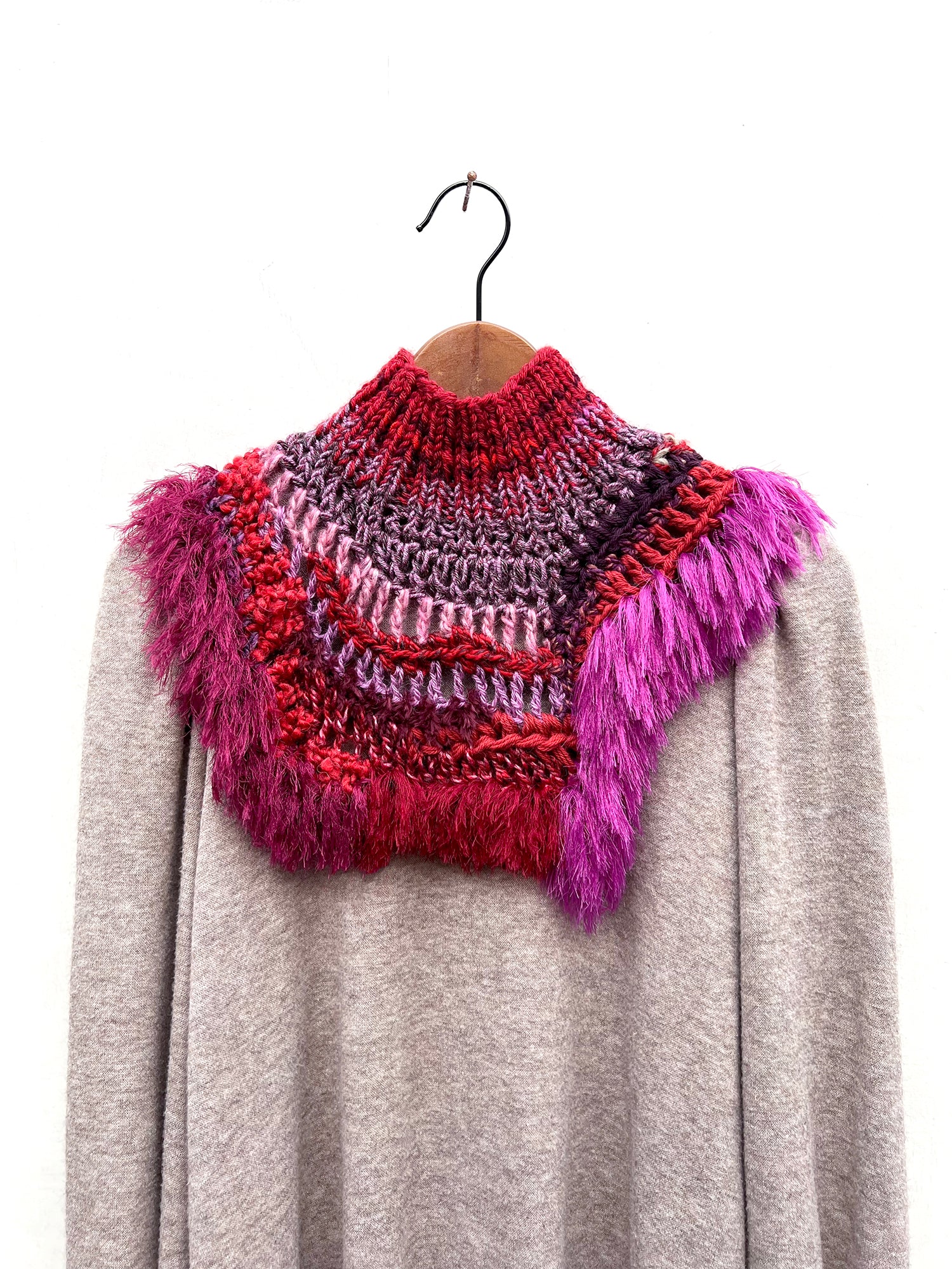Wrap yourself in this one-of-a-kind neckpiece and feel the warmth of something special. Handmade with a mix of soft textured yarns, a touch of faux fur and wispy fringe.?